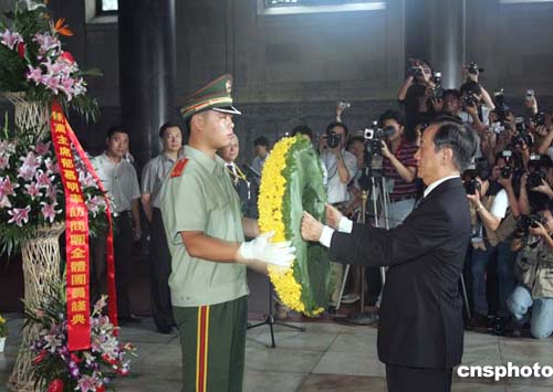中新社南京七月八日電(記者陳光明丁梅趙海燕)“新黨紀(jì)念抗戰(zhàn)勝利六十周年大陸訪問(wèn)團(tuán)”今天早晨拜謁南京中山陵,全體團(tuán)員每人手持一枝白色百合花,敬獻(xiàn)在孫中山先生的靈寢前。