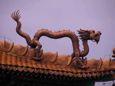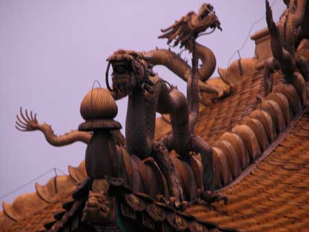 中新網7月9日電 承德“外八廟”之一的須彌福壽之廟主殿屋頂共有八條金色行龍,每條約重一噸,鼓目生威。