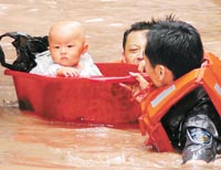7月8日,達州市的兩名救援人員正用澡盆轉移一名兒童。甘紅攝/四川在線