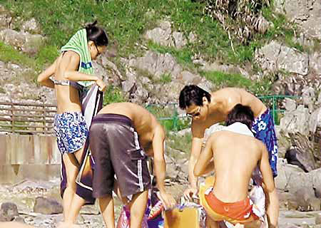 比基尼美女卻沒好氣地自顧自下水,撇下幾位猛男留在沙灘上繼續享受陽光,3個男人沒看美女又無美女看他們,舒適地在沙灘享受陽光,不過隔了一會卻被他們發現有記者,他們便實時收拾行裝撤退,打消了曬太陽的雅興。