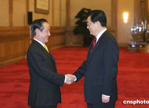 中共中央總書記胡錦濤7月12日在北京人民大會堂會見了臺灣新黨主席郁慕明率領的臺灣新黨“民族之旅”訪問團。作者:毛建軍