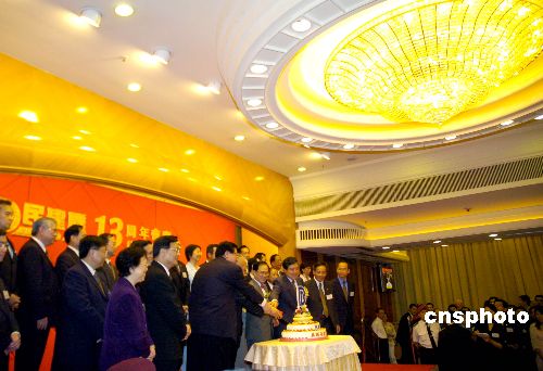 中新社香港七月十二日電(記者邢健)香港民建聯今天晚上在中環大會堂舉辦成立十三周年會慶酒會,全國政協副主席董建華、香港特區行政長官曾蔭權、中聯辦主任高祀仁和外交部駐港特派員楊文昌作為主禮嘉賓,出席了酒會的切蛋糕儀式。