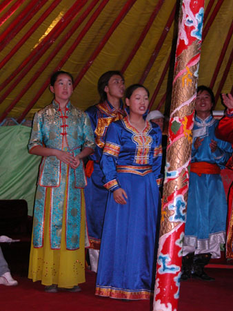 隨后,工作人員將把游客引領到傳統蒙古族居所——蒙古包內。蒙古包內的桌子上擺有蒙古族傳統食品,包括奶茶、黃油、奶豆腐等。在工作人員嘹亮蒙古族民歌歌聲與悠揚馬頭琴的伴奏下,游客可以盡情享用美食。