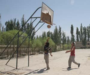 英吉沙縣艾古斯鄉(xiāng)的兩個維吾爾少年在記者的鏡頭下盡力展示自己的籃球天賦。