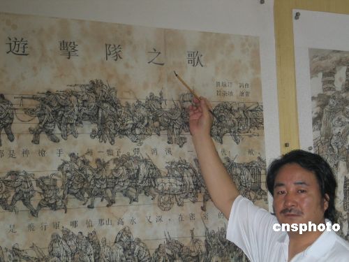 為紀念抗戰勝利六十周年,西安畫家賀榮敏用畫筆“畫”出《游擊隊之歌》。整幅畫卷以五線樂譜為基本構圖,保留了樂譜線和歌詞,跳動的音符轉化為游擊隊員戰斗的身影。作者:冽瑋