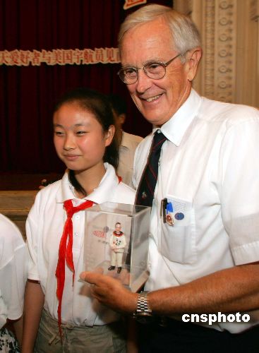 正當美國“發現號”航天飛機遨游太空吸引全球目光時,八月一日,“發現號”的前指令長查爾斯·博爾登(左四)、曾隨阿波羅號登月的航天員查爾斯·杜克(左二)、美國首位黑人女航天員梅·杰米森(左五)來到上海中福會少年宮,與上海少年航天愛好者見面。