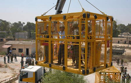 扮演拒不撤離的猶太定居者的警察被關進鐵籠