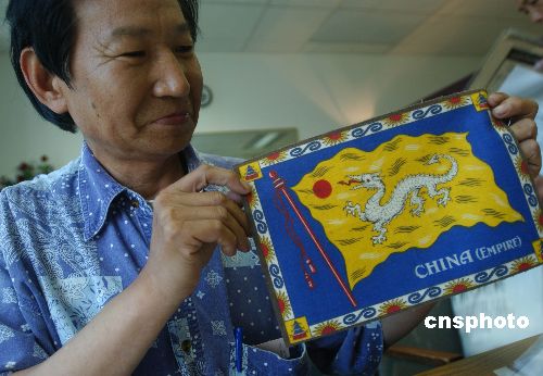 旅美華人美術教授喬文安七月底展示他收藏的美國珍貴煙標,它是一百多年前美國煙草公司特意為出口中國的精品而設計,專用絲織的白龍黃旗下注明:“中國皇家”,為中美經貿歷史的證物。作者:賈國榮