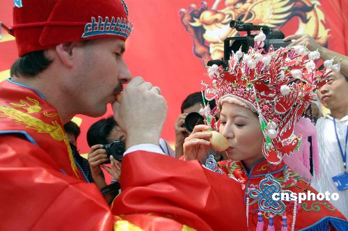 8月14日,濟南市大明湖景區,來自荷蘭的楊文軒(Jan)先生與濟南姑娘黨妍舉行了一場傳統的中國式婚禮,婚禮上倆人按照中國的傳統習俗舉行了坐花轎、掀蓋頭、夫妻對拜等儀式。新娘黨妍今年28歲,2003年9月遠赴荷蘭愛因霍芬科技大學學習計算機專業,同年認識了荷蘭小伙楊文軒(Jan),從此就開始了這段跨國姻緣。作者:龔輝