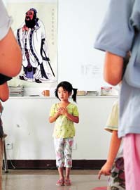 教室正面懸掛著“大成至圣先師孔子像”,孩子們每天上課前都要向孔圣人鞠躬行禮。孔子究竟是誰,孩子們嚷嚷說:是詩人、是父親。在老師的帶領下,孩子們手捧《弟子規》賣力地朗讀著,“凡出言,信為先,詐與妄,奚可焉”。“我們鼓勵背誦,不強求理解。”張鳳友的老伴崔愛華退休前在北京城里的一所中學工作。城里熱鬧一時的“國學爭論”,崔愛華看在眼里。在自費或靠別人布施印制的《弟子規》課本最后,崔愛華附上了一篇小文———《讀誦經典的好處與成效》。“《弟子規》對孩子絕對是有影響的,這種影響可能不會馬上顯現,它是潛移默化的,隨著孩子的成長慢慢表現出來。”崔愛華說。