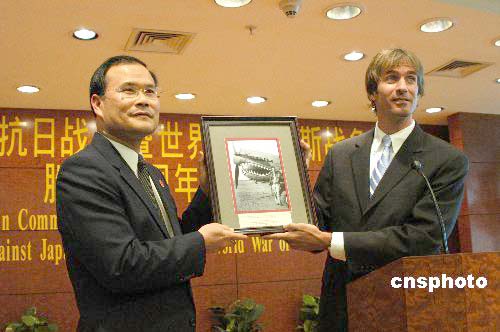 據(jù)美國《僑報》報道,在中國駐紐約總領(lǐng)館17日晚舉行的紀念抗日戰(zhàn)爭暨世界反法西斯戰(zhàn)爭勝利60周年招待會上,劉碧偉代表總領(lǐng)館,接受了這份見證中美兩國聯(lián)合抗擊法西斯侵略的珍貴紀念品。