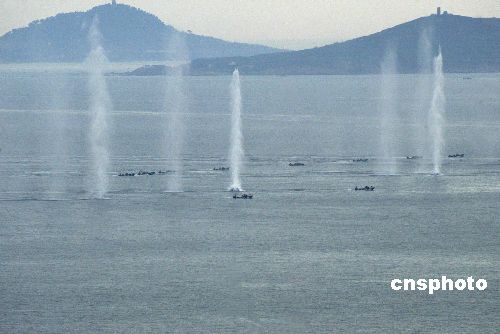 八月二十四日,“和平使命—2005”中俄聯合軍事演習第三階段兩棲登陸作戰實兵演練在山東半島展開。圖為陸戰隊搶灘登陸時,受到來自敵方的炮火襲擊。作者:王麗南