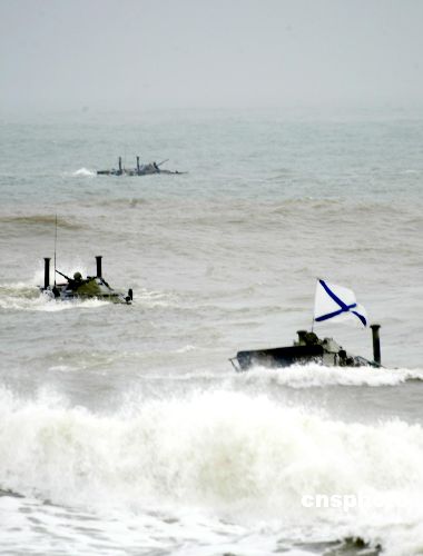八月二十四日,盡管山東半島天氣惡劣“和平使命—2005”中俄聯合軍事演習兩棲登陸作戰實兵演練如期進行。圖為參加兩棲登陸作戰演練的陸戰隊員乘裝甲運兵車劈浪向岸邊靠近。作者:王麗南