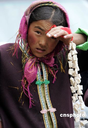由于越來越多的游客光顧神秘的世界屋脊--西藏,當地越來越多的藏族人涉足旅游服務業的新領域。一名藏族女孩于今年旅游旺季在通往江孜古城的路旁飯店出售藏族傳統食品——奶塊,由于剛剛入道,不免有些害羞。(作者:任晨鳴)