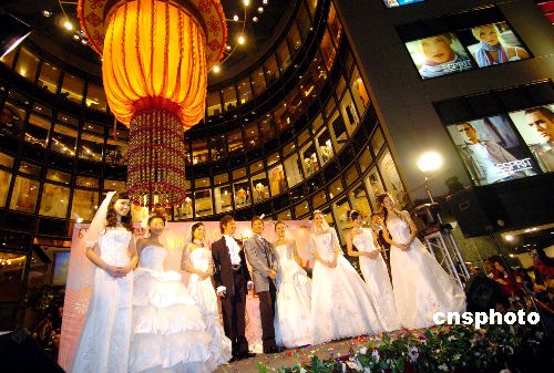 2月14日,香港銅鑼灣世貿(mào)中心廣場舉辦世紀(jì)婚禮慶祝情人節(jié),模特在迷人燈光襯托下,展示2006年春夏新款婚紗。 作者:洪少葵