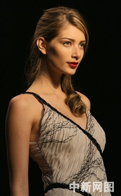 2006年2月14日,倫敦時裝周在倫敦自然歷史博物館開幕。圖為模特在時裝周開幕第一天展示設(shè)計師Amanda Wakeley的作品。