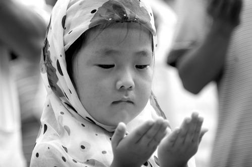 8月15日,一名穆斯林兒童在山東省郯城縣馬頭鎮清真寺哀悼甘肅舟曲特大山洪泥石流遇難同胞。