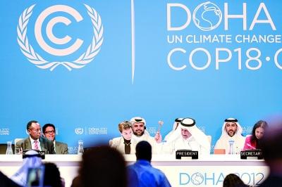 在經歷一天的超時談判后,阿卜杜拉·阿提亞當晚宣布,大會通過包括《京都議定書》(《議定書》)修正案在內的一攬子決議。 (記者 李木子 )