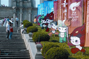 為迎接5月3日北京奧運圣火于澳門傳遞,現在澳門部分街道如地標大三巴牌坊等名勝掛上火炬傳遞的宣傳裝飾,為迎接即將來臨的火炬作好準備。
