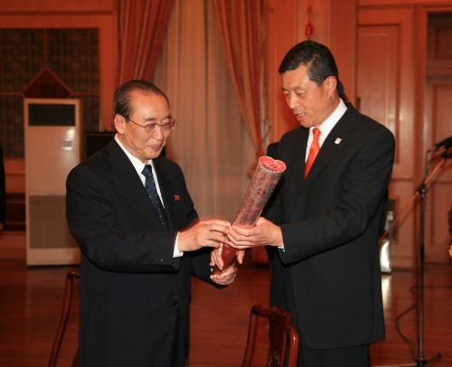 劉曉明說,在這春光明媚、鮮花盛開的美好季節(jié),我很高興與朝鮮各界朋友和外交使團(tuán)同事們歡聚一堂,共同迎接北京奧運(yùn)圣火的到來。我謹(jǐn)代表中國大使館對楊亨燮副委員長出席今晚的招待會表示衷心的感謝,對各位朝鮮同志和奧運(yùn)火炬接力途經(jīng)國家的使節(jié)們的到來表示熱烈的歡迎!