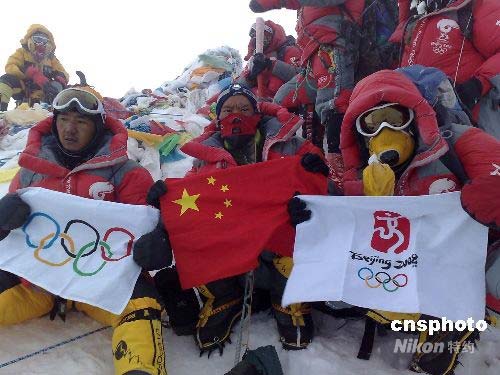 5月8日,北京奧運圣火珠峰傳遞登山隊成功登頂珠穆朗瑪峰。這是登山隊員在峰頂展示“祥云”火炬、火種燈、中國國旗、奧運五環旗和北京奧運會會徽旗。中新社發 阿旺扎西 攝