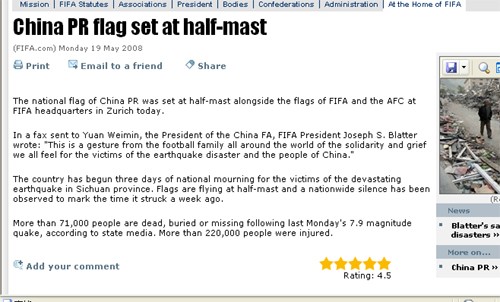 國際足聯(lián)19日在其官方網(wǎng)站發(fā)布了一條消息,稱國際足聯(lián)用下半旗的方式哀悼四川地震的遇難者。讓人有些遺憾的是,國際足聯(lián)主席布拉特在慰問信中,將中國足協(xié)主席的名字錯(cuò)寫成“袁偉民”,而不是“劉鵬”。
