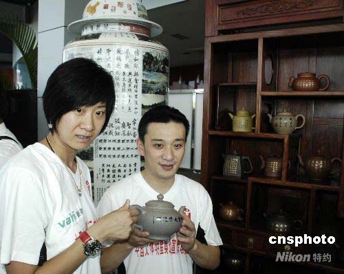 7月12日,“2008奧林匹克文化中國行”在海南三亞開幕。作為全國巡展的首站,三亞的展覽活動歷時兩天,公開展示由226名書畫家共同創(chuàng)作的奧運主題大型書畫作品《神州圣火傳遞圖》和《神州圣火傳遞頌》。作品全面描繪了113個火炬?zhèn)鬟f城市的風土人情。活動期間還展出奧運文化優(yōu)秀作品“中華紫砂壺”和“盛世將軍瓶”。圖為1996年亞特蘭大奧運會游泳冠軍樂靜宜(左)和2000年悉尼奧運會跳水冠軍肖海亮(右),在“中華紫砂壺”和“盛世將軍瓶”前展示“中華紫砂壺”。中新社發(fā) 尹海明 攝