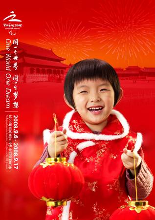 北京奧組委今天(18日)正式對外公布了北京2008年奧運會、殘奧會官方海報和官方圖片。圖為人文海報《微笑北京 共享奧運》。微笑的北京歡迎世界各地的人們共享北京奧運。孩子、青年、老人的微笑,洋溢著中國人的熱情與友好,共同演繹“同一個世界 同一個夢想”的和諧樂章。該方案三幅合一成為組畫。