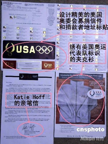 7月22日,記者收到的一封募捐信說(shuō):你只需捐20美元,就可以獲得一件如圖所示的繡著美國(guó)奧運(yùn)代表隊(duì)標(biāo)記的運(yùn)動(dòng)夾克。更重要的是,這意味著你支持了美國(guó)奧運(yùn)代表隊(duì)前往北京參賽的路費(fèi)。信中還附有美國(guó)游泳女一號(hào)種子選手霍芙的親筆募捐信。圖為來(lái)自美國(guó)奧委會(huì)的募捐信件內(nèi)容。 中新社發(fā) 邱江波 攝