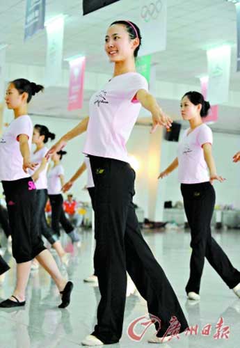 馬妮老師介紹,“我們在訓練加上了不少京劇中的動作,如道萬福、走云步以及‘一串樹葉走路’方式。”馬妮老師解釋說,“‘一串樹葉走路’方式其實是東方人特有的走法,就是以手臂為‘莖’,雙腳沿著‘莖’的兩側走。”從她的示范動作看,有點近似于旗人女子踩著特制圓底高跟鞋走路的裊娜姿態。邁步的步幅乃至手臂擺動的高度,“我要求她們自然、樸實、不做作。”馬妮老師說,“事實上形體培訓更主要的是培養她們的心理狀態,在讓她們身體更挺拔的同時,一定要達到形神兼備。”