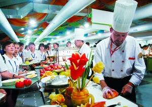 奧運村餐廳堪稱“萬人大食堂”,主餐廳位于居住區的北側,提供24小時餐飲服務。記者看到,餐廳設有四大餐區:國際餐區、地中海餐區、亞洲餐區及中國餐區,還包括猶太餐、清真餐、印度餐等菜品,并有明顯的菜單標牌提示,供村民選擇。名聞天下的北京烤鴨也進駐了奧運村,運動員每天都可品嘗。餐廳按照70%西餐、30%中餐比例配備菜品,并且菜單8天一個循環周期。