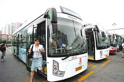 昨天(29日),氫燃料電池公交車在六里橋客運中心亮相,這種零排放公交車將服務奧運。記者范繼文攝