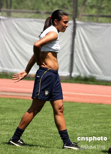 8月3日,巴西女足靈魂人物、“世界足球小姐”瑪塔長衣短打扮。當日,巴西女足隊員于炎熱的中午在沈陽奧體中心訓練場進行訓練。中新社發 張宇 攝