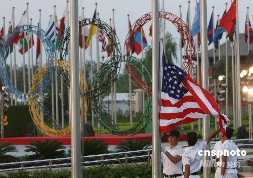 8月5日晚,參加北京奧運會的美國代表團在北京奧運村舉行升旗儀式,奧運村村長陳至立等出席。中新社發 武仲林 攝