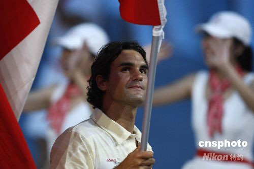 8月8日,第29屆夏季奧運會在北京奧林匹克公園內的國家體育場“鳥巢”開幕。各個奧運代表團的旗手都是該國的體育明星。圖為瑞士奧運代表團旗手“網球天王”費德勒。 中新社發 杜洋 攝