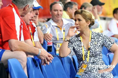 八月九日晚,北京奧運馬術項目在香港沙田賽場舉行盛裝舞步賽事,國際馬術聯合會主席、約旦公主哈雅到場觀賽,并與參賽隊伍職員在看臺上交談。中新社發 鄧慶樂 攝
