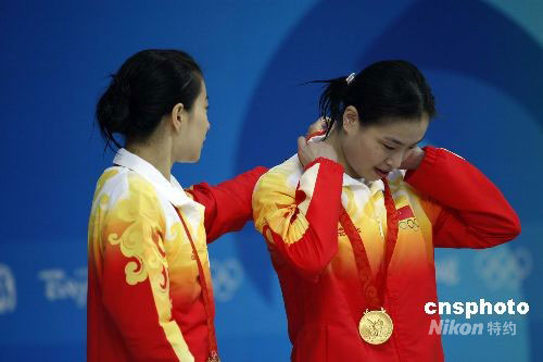 8月10日,素有“夢之隊(duì)”之稱的中國跳水隊(duì)黃金組合郭晶晶和吳敏霞輕松獲得女子雙人三米板金牌。圖為郭晶晶在領(lǐng)獎(jiǎng)臺上幫吳敏霞整理衣領(lǐng)。中新社發(fā) 杜洋 攝