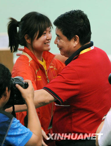 8月10日,中國選手郭文珺(左)與中國射擊隊總教練王義夫擁抱,慶祝勝利。當日,在北京奧運會射擊女子10米氣手槍比賽中,中國選手郭文珺獲得金牌。 新華社記者 李尕攝 圖片來源:新華網