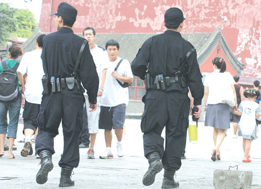 8月11日,幾名特警在故宮的端門和午門景點佩槍巡邏,保護(hù)中外游客人身安全。吳長青攝