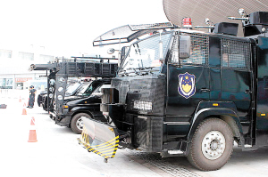 目前,本市(天津)特警300余人24小時護衛奧運會天津賽區安全。昨天,記者探訪了在水滴實施護衛的特警突擊車、裝甲車、運兵車和水炮車。
