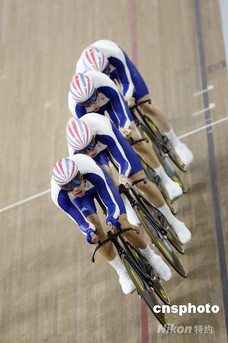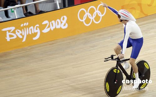 8月18日,北京奧運會場地自行車男子4公里團體追逐賽決賽在老山自行車館舉行,英國隊以3分53秒314的成績獲得金牌,打破世界紀錄。 中新社發 盛佳鵬 攝