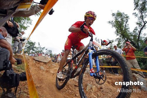 8月23日,在北京老山山地自行車場進行的奧運會男子自行車越野賽中,中國選手姬建華名列第22位。中新社發 盛佳鵬 攝