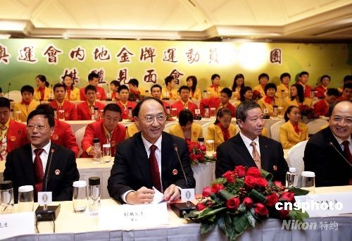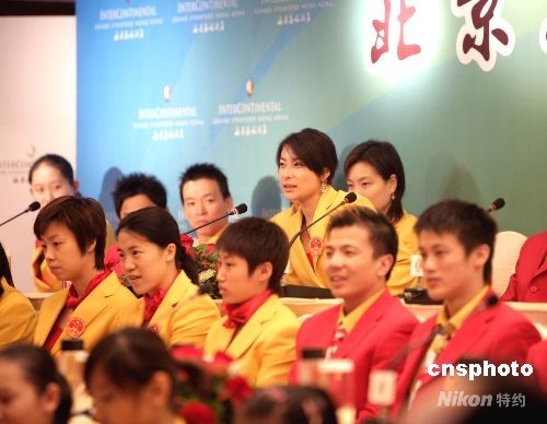北京奧運會金牌運動員代表團八月二十九日至三十一日訪問香港。八月二十九日下午代表團抵達香港后舉行媒體見面會。中新社發 張勤 攝