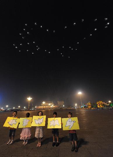 9月6日,來自中國、喀麥隆、以色列、巴基斯坦和愛爾蘭(從左到右)的小朋友舉起和平鴿圖片與天安門上空的和平鴿造型焰火遙相呼應(yīng)。當(dāng)日,北京2008年殘奧會開幕式在國家體育場隆重舉行。新華社記者 王小川 攝