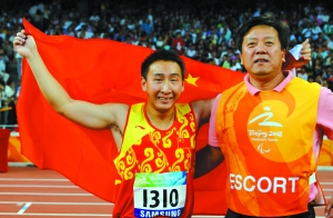 “這是我頭一次參加殘奧會,拿金牌、破紀(jì)錄,也算給我的教練一份驚喜吧,我想這是最好的教師節(jié)禮物,”雖然父母、親友都在看臺上助陣,朱鵬凱還是最想把這塊金牌獻(xiàn)給自己的教練韓松,“是教練發(fā)現(xiàn)了我,從2003年到現(xiàn)在,我一直跟著他練,5年多了他為我付出很多,可以說除了睡覺,我們倆幾乎一直綁在一起。”朱鵬凱笑著說。