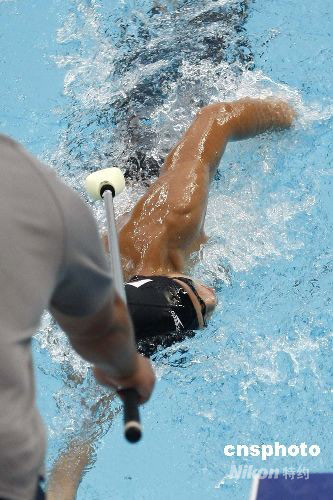 北京2008年殘奧會游泳S11級男子400米自由泳預賽,在北京國家游泳中心“水立方”進行,教練在泳池邊為選手“指路”。中新社發 盛佳鵬 攝