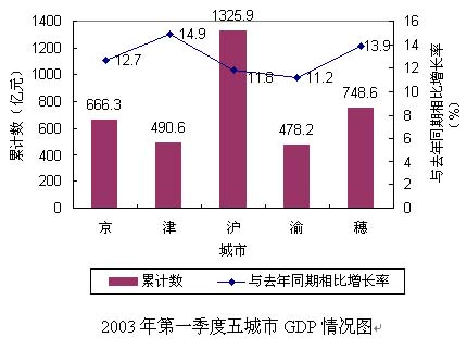 、.2003年第一季度五個城市的GDP總量均實現了兩位數增長