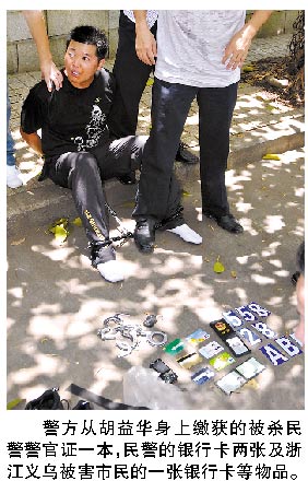胡益華作案后十分殘忍冷血,殺人后還不忘搜索受害者身上有價值的物品,以便攜帶潛逃。據警方通報,胡益華歸案后,除了從他身上搜出槍支外,還從他身上搜出廣東被殺民警警官證一本,民警的銀行卡兩張及浙江義烏被害市民的一張銀行卡。