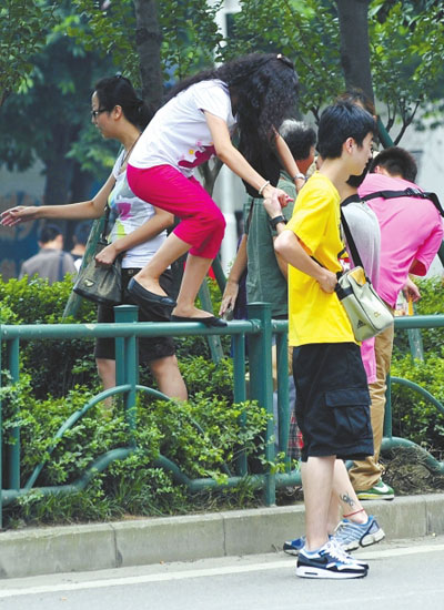 就為了走近路,穿著短裙的美女也顧不上走光的尷尬,從護(hù)欄上一跨而過。