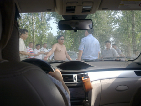 面對民警,在摩托車被推開后,不明身份人員仍不愿放行,“金鏈子”裸著上身更是蹲在車前不肯起來,稱“除非賠我們莊稼錢”……經(jīng)民警多次勸說,記者終于在當(dāng)日下午4時(shí)許安全抵達(dá)了狼城崗鎮(zhèn)政府。
